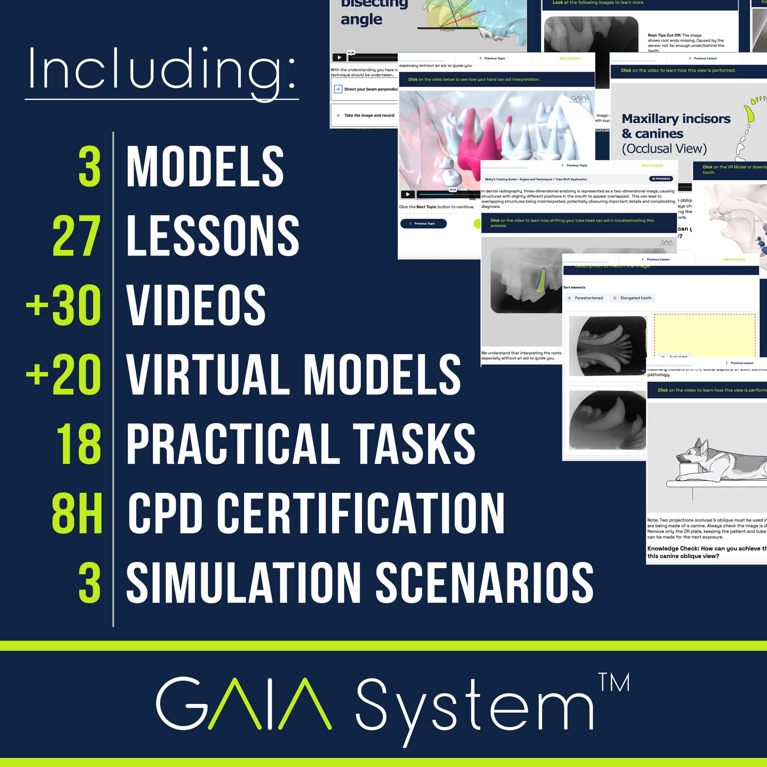 The complete simulation-based training system for consistent, diagnostic dental radiographs. Stop guessing angles. Stop relying on one person who “just knows how to do it.” The GAIA Training System gives you a structured path from foundations to full-mouth studies in under 20 minutes — using simulation, not trial and error on real patients.